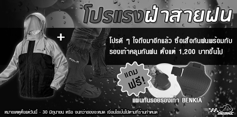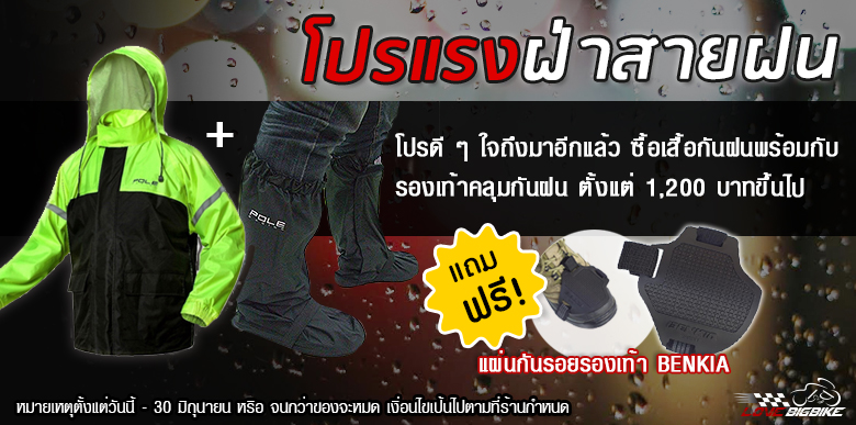 ฝนจะตกเพียงใดจะไปกลัวทำไมเล่า วันนี้ Lovebigbike จัดโปรดีให้ฝ่าพายุฝนกันได้อย่างสบาย ๆ ซื้อเสื้อกันฝนพร้อมกับ รองเท้าคลุมกันฝน แถมฟรี การ์ดรองเท้า BENKIA สุดฮอต งานนี้ทั้งไม่เปียก และ ยังได้ของแถมด้วยครับรีบจัดกันวันนี้ – 30 มิถุนายน หรือ จนกว่าของจะหมด